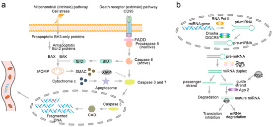 The fragmentation mechanism of DNA during apoptosis and the generation of miRNA. (a) Fragmentation of DNA. The activation pathways of caspases include the intrinsic (mitochondrial) pathway (left) and the extrinsic (death receptor) pathway (right). Upon activation within the nucleus, caspases further activate DNase (caspase-activated DNase, CAD). CAD then induces DNA fragmentation by converting DNA into mononucleosomal DNA, leading to a characteristic pattern of plasma DNA fragmentation that can be detected in the circulation. (b) The generation of miRNA. miRNA genes are transcribed into primary miRNAs (pri-miRNAs) in the nucleus, which are then processed by Drosha into precursor miRNAs (pre-miRNAs). The pre-miRNAs are exported to the cytoplasm and further processed by Dicer into mature, single-stranded miRNAs that regulate gene expression by targeting mRNAs.