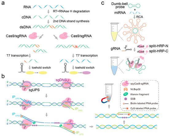 In vitro, CRISPR-Cas9 forms a complex guided by crRNA-trancrRNA (gRNA) that specifically targets double-stranded DNA, causing double-strand breaks, making it widely applicable in nucleic acid detection. CRISPR-Cas9 does not cleave target sequences when the PAM region experiences single-base mismatches. Building on this concept, Pardee et al. pioneered the use of Cas9 protein in nucleic acid biosensing, developing a Zika Virus variant genotyping method known as NASBACC with single-base resolution [78]. This method initially employs NASBA technology for isothermal amplification of viral RNA molecules, followed by specific recognition and cleavage of target sequences by CRISPR-Cas9, thereby preventing activation of the toehold switch. In scenarios where the target lacks a PAM sequence, RNA products activate the toehold switch, triggering a colorimetric response (Figure 4a). However, this method requires the enrichment of nucleic acid in the early stage, which is complicated, and it is easy to introduce mutations in the enrichment process. The formation of DNA R-loops and double-strand breaks in dsDNA by Cas9 is mediated through the separate cleavage of the non-target and target strands by its RuvC and HNH domains, respectively [79,80]. Programmable Cas9 nickases (Cas9n), capable of generating strand-specific cuts in dsDNA, are achieved through the introduction of D10A mutation in the RuvC domain or the H840A mutation in the HNH domain [81,82]. Zhou et al. developed a CRISPR-Cas9n-triggered endonuclease-mediated strand displacement amplification (CRISDA), a typical Cas9n detection scheme [83]. In CRISDA reactions, Cas9n first generates a cleavage at the dsDNA target site, followed by a linear strand displacement reaction and exponential amplification triggered by a pair of initiating primers (IP). Each IP primer consists of a single Nb.BbvCI endonuclease cleavage site, a central hybridization region, and a 3′ overhang complementary to the displaced non-target strand. Experimental results demonstrate that IP primers efficiently initiate exponential amplification as long as the melting temperature of the 3′ overhang exceeds 50 °C without requiring further optimization (Figure 4b); the experimental data also proved that Cas9-mediated CRISDA has relatively high sensitivity and specificity in DNA detection, and can detect single-base mutations; however, like PCR-based amplification, CRISDA also has an amplification bias when performing amplification. If mutations occur simultaneously at the RuvC D10A and HNH H840A sites of Cas9, it results in the formation of a nuclease-deficient Cas9 (dCas9) [84]. The dCas9-gRNA complex retains the capability to bind to the target dsDNA but loses its ability to cleave DNA. Qiu et al. developed a detection platform for microRNAs (miRNAs) with lengths ranging from 18 to 24 nucleotides using the dimerization principle, termed RCA-CRISPR-split-HRP (RCH) [85]. The RCH method initiates with the specific binding of target miRNA to probes, triggering strand displacement reactions that form structures conducive to rolling circle amplification (RCA). Subsequently, guided by specific sgRNA, split-HRP-dCas9 fusion proteins are recruited to the vicinity of RCA products, activating HRP enzymatic activity, thereby generating a colorimetric response (Figure 4c).
