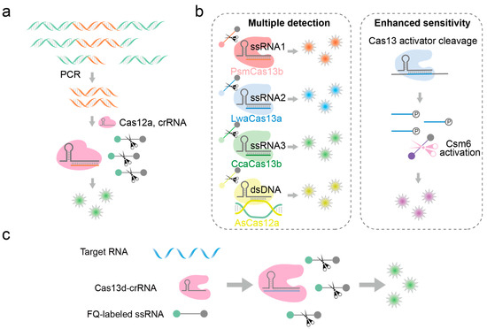 Detection of fragmented nucleic acid molecules based on CRISPR-Cas12 and CRISPR-Cas13 systems. (a) HOLMES: Firstly, PCR reaction is used to enrich the nucleic acid to be detected. Then, the CRISPR-Cas12a system targets and binds to the nucleic acid to be detected and finally triggers a trans-cleavage reaction to cleave the fluorescent probe and release a fluorescent signal. (b) SHERLOCKv2: LwaCas13a, PsmCas13b, CcaCas13b, and AsCas12a simultaneously detect multiple viruses, among which Csm6 can cleave reporter molecules after being activated by cleavage byproducts. (c) Nucleic acid detection technology based on CRISPR-EsCas13d and CRISPR-RspCas13d.