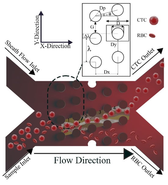 Microfluidic devices are miniaturized systems that can regulate the flow of liquids, suspended cells, and particles with high accuracy while continuously using only a small amount of a sample volume [1]. The separation of certain bioparticles within a sample is one of the most frequently used microfluidic capabilities for lab-on-a-chip technology [2]. This application makes the development of effective treatments and the diagnosis of many ailments possible. Particle analysis and separation techniques are two crucial phases that must be quick, inexpensive, effective, and continuous [3,4,5,6,7,8,9,10,11,12]. Numerous biomedical and biological experiments need the separation of cells; hence, various microfluidic separation techniques have been developed in response [13,14]. Microfluidics is frequently used for this purpose and makes separating target particles from biofluids like blood and urine with low concentrations possible [15]. In microfluidic systems, the separation of bioparticles mostly depends on the particles’ physical characteristics, for example, mass, size, electrical positivity or negativity, etc., and usually falls among active and passive types [16,17,18,19,20]. Microfluidics that sorts the particles and the flow using external fields is used as an active sorter. Dielectrophoresis, electrophoresis, magnetophoresis, thermophoresis, and acoustophoresis are a few active separation techniques. By applying non-uniform electric fields to the channel, dielectrophoresis separates particles according to their size and capacitance [21,22,23,24]. For particles to be segregated in the channel according to differences in their size, concentration, and the degree to which they can be compressed, acoustophoresis transmits bulk or ultrasonic surface waves [25,26,27,28,29,30]. Particles can be sorted by magnetophoresis, either intrinsically or super-paramagnetically, according to their magnetic susceptibilities [31,32,33,34,35,36]. On the other hand, passive systems, which offer comparable ease of use and output to the aforementioned method, primarily rely on the channel’s shape and hydrodynamic forces for separation [37]. Among the passive methods are deterministic lateral displacement (DLD) [38], pinched-flow fractionation (PFF), and hydrodynamic filtration [17,18,39,40,41,42].