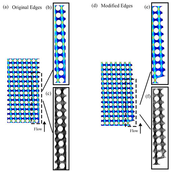 DLD simulations models with (a) original and (d) modified edges. A closer look at (b) the velocity contour, (c) the streamline of original edges, (e) the velocity contour, and (f) the streamline of modified edges. The color scale represents fluid velocity: blue for low-velocity or stationary regions (e.g., near the channel walls), green for intermediate-velocity regions, and red for high-velocity regions (e.g., at the center of the channel in laminar flow).