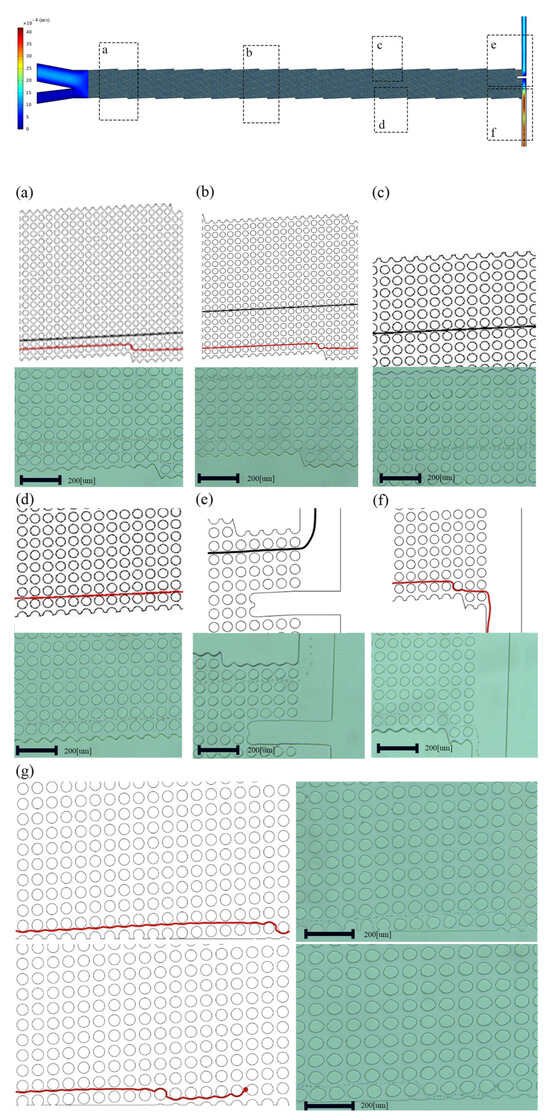 Both fluid simulations and experiments showing (a–f) modified edges and (g) original edges. A closer examination reveals how the device’s boundary affects particle separation and clogging in the channel.