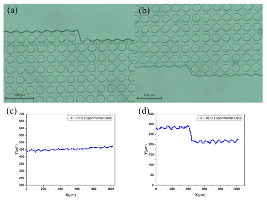(a) CTC and (b) blood cell separation image and the movement path of two particles in (c) bump and (d) zigzag mode.