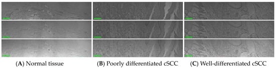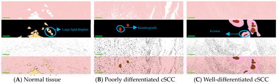 Pathological diagnosis has traditionally been considered the gold standard, relying on the assessment of tissue structure and cytological features. The grading of cSCC is determined based on the extent to which the characteristics of squamous epithelium, such as intracellular bridges and keratinization, as well as pleomorphism and mitotic activity, can be effectively recognized [7,8]. Pathologically poorly differentiated cSCC plays a significant role in identifying high-risk cSCC, leading to unfavorable prognosis and necessitating more aggressive treatment measures. On the contrary, well differentiated cSCC serves as a crucial indicator for low-risk cSCC, associated with a favorable prognosis [9]. However, the assessment of differentiation levels (well or poorly) in pathological analysis relies predominantly on subjective judgments, therefore resulting in potential intra- and inter-observer variability. Consequently, there is a need for a valuable approach to overcome these limitations.