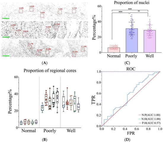 As shown in Figure 4A, the mosaic images depict the nucleo/cytoplasmic ratio per window of normal, well-differentiated, and poorly differentiated tissues. The nucleo/plasmic ratio of normal skin is significantly lower compared to that of cSCC. Statistical analysis was performed on ten windows for each slice, and the distribution of the nucleo/cytoplasmic ratio is shown in Figure 4B. which also shows that there is a significant difference in nuclei area between normal skin and cSCC (p < 0.001) (Figure 4C). For further discrimination between these tissues, we conducted an in-depth analysis of the specificity and accuracy of the nuclear area proportion. The resultant ROC curve comparisons among normal, poorly differentiated, and highly differentiated tissues are displayed in Figure 4D.