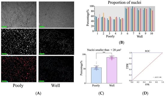 The nuclear size was calculated within segmented individual nuclear images as a measure of nuclear heterogeneity. The proportion of nuclei below 10 μm2, 20 μm2, 30 μm2, and 40 μm2 relative to the total number of nuclei in the segmentation image were calculated from five fields of section on each slide. The analysis revealed that utilizing a threshold of 20 μm2 effectively distinguished between poorly and well-differentiated cSCC. All nuclei exceeding 20 μm2 were distinctly marked on the segmentation image (Figure 5A). In the subsequent data analysis, five images were evaluated for each specimen slide. We calculated the proportion of cell nuclei having an area smaller than 20 μm2 in each image. The percentage of nuclei smaller than 20 μm2 in poorly differentiated cSCC was significantly lower than that in well-differentiated tissues (p < 0.001) (Figure 5B,C). Then, we conducted specificity and accuracy analyses to thoroughly evaluate the number and proportion of nuclei, and the results of the ROC curve are shown in Figure 5D.