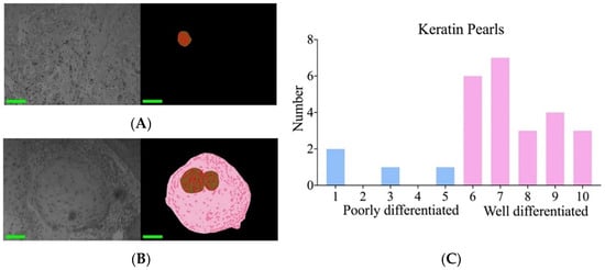 Keratin pearls in cSCC. (A) Original image and segmented pseudo-color image of poorly differentiated tissue. (B) Original image and segmented pseudo-color image of well-differentiated tissue. (C) The number of keratin pearls in the upper 10 images per slide was calculated.