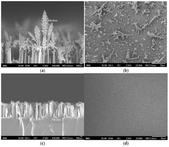 Characteristic cross and top view SEM images of Si nanowires with height of approximately 250 nm decorated with 800 nm-long Ag dendrites (a,b) or Si nanowires with height of approximately 500 nm decorated with approximately 150 nm-long Ag aggregates (c,d). The cross-view images (a,c) have been received with a higher magnification to show in detail the Ag nanoparticles’ structure whereas the top view images (b,d) with a lower magnification to demonstrate the distribution of these structures across the substrate surface.