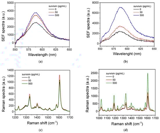 (a,b) SEF spectra obtained from nanostructured Ag/Si substrates with Ag dendrites following a one-step (a) or a two-step survivin immunoassay (b) for the zero calibrator (black line) and calibrators containing 50 (red line) and 500 pg/mL (blue line). (c,d) SERS spectra obtained from nanostructured Ag/Si substrates with Ag aggregates following a one-step (c) or a two-step survivin immunoassay (d) for the zero calibrator (black line) and calibrators containing 50 (red line) and 500 pg/mL (green line).