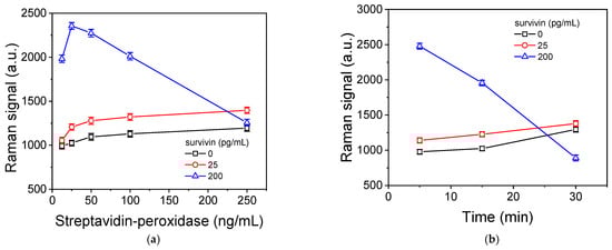 Most assay parameters, including the concentrations of the capture and detection antibodies, the composition of the buffers used, and the duration of the two immunoassay steps defined during the optimization of the survivin SEF immunoassay, were applied to the SERS substrates for the development of the respective immunoassays. The step that differs between the two detection approaches is the use of the streptavidin conjugate regarding the Au nanoparticles modified with 4-MBA (4-MBA-AuNPs-streptavidin) or streptavidin labeled with peroxidase in combination with the precipitating substrate (TMB) instead of the fluorescently labeled streptavidin [,]. As shown in Figure S7, the net Raman signal corresponding to a calibrator of 50 pg/mL is at least five times lower in the case of the 4-MBA-AuNPs-streptavidin compared to that obtained using streptavidin-peroxidase and the TMB precipitating substrate for signal acquisition. This was to a great extent expected since the use of the enzyme results in significant signal enhancement due to the continuous creation of the enzymatic reaction products over time. Thus, the latter method was selected for the development of the SERS assay, and the optimum streptavidin-peroxidase concentration and the incubation duration with the precipitating peroxidase substrate were determined. The concentration of streptavidin was determined taking into account the zero calibrator signal and the signals corresponding to low- (25 pg/mL) and high-concentration calibrators (200 pg/mL). It was found that the absolute zero and lower-concentration calibrator signals, as well as the respective net signal, increased and reached maximum plateau values for streptavidin-peroxidase concentrations equal to or higher than 100 ng/mL. On the contrary, the absolute and net signals corresponding to the high-concentration calibrators increased as the streptavidin-peroxidase concentration increased up to 50 ng/mL and then deceased as the streptavidin-peroxidase concentration further increased (Figure 5a). The same phenomenon was observed for a fixed streptavidin-peroxidase concentration of 25 ng/mL as the incubation time with the precipitating solution was increased from 5 to 30 min (Figure 5b).