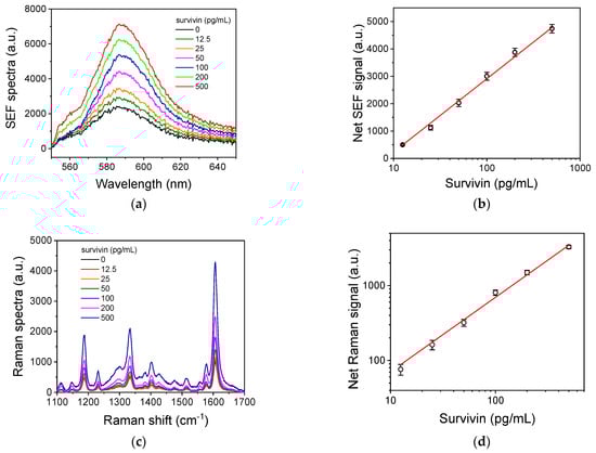 In Figure 6, characteristic SEF (Figure 6a) and SERS spectra (Figure 6c) corresponding to different survivin calibrators are presented, along with the respective calibration curves (Figure 6b and Figure 6d, respectively). The linear regression equation of the SEF curve was y = −2451(±26) + 2680(±21) × log[x], with a coefficient of regression of R2 = 0.998; and the linear regression equation of the SERS curve was log[y] = 0.85(±0.10) + 0.99(±0.04) × log[x], with a coefficient of regression of R2 = 0.993.