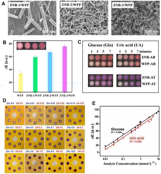 An example of a ZnO nanomaterial-based colorimetric biosensor is shown. ZnO NR-modified μPADs were developed as colorimetric biosensors for the detection of glucose and uric acid while employing the chromogenic reagents of AB and AT. (A) The scanning electron microscopy (SEM) panels display the ZnO NRs grown to ~5 μm in length on a Whatman filter paper (WFP). The diameters of the NRs on the μPADs are 500–700 nm for the ZNR-1/WFP, ~200 nm for ZNR-2/WFP, and ~20 nm for ZNR-3/WFP samples. (B) The plot displays the color differences (ΔE) observed from an unmodified WFP, as well as the three ZNR/WFP samples, when 1 mmol/L of uric acid was added to the μPAD sensor containing AB. (C) The colors developed on the ZnO NR-modified μPAD sensors at different incubation times are shown for the detection of both glucose and uric acid. For both analytes, the color images correspond to the case of 1 mmol/L of analyte with AB or AT reacted up to 7 min, as specified for each image. (D) The marked images show the detection layer of a ZNR-3/WFP device when the different concentrations of uric acid and glucose were added to the ZnO NR-modified μPAD biosensor. (E) The graph displays representative calibration curves obtained from the ZnO NR-modified μPAD colorimetric biosensor for the detection of uric acid and glucose. Adapted with permission from Ref. [10], copyright (2021) Elsevier B.V.