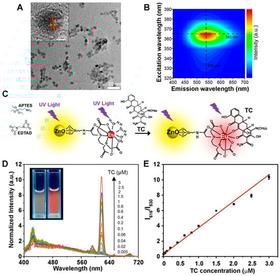 An example of ZnO nanomaterials developed as QD fluorophores is displayed. (A) The panel corresponds to a transmission electron microscopy (TEM) image of ~5 nm ZnO QDs used in the detection of TC. The high-resolution image in the inset shows lattice fringes at a distance of 0.28 nm due to the inter-plane distance of the ZnO (100) plane. (B) The excitation and emission spectra of the ZnO QDs are shown in the contour plot. (C) The schematic illustrates how Eu/ZnO nanostructures were constructed for TC detection. Using the chemical reaction schemes, Eu3+ was anchored on the surface of the Eu/ZnO QD fluorescent probe for the rare earth ion’s sensitization by TC. (D) The plot displays the emission spectra of the Eu/ZnO QDs under varying concentrations of TC up to 3 μM. The photographs in the inset were taken from the solution of the Eu/ZnO QDs with no TC (left) and 3 μM TC (right) under a 365 nm UV lamp. (E) The ratiometric calibration curve of the biosensor employing the fluorophores of Eu/ZnO QDs is shown as a function of TC concentration. The basis of the ratiometric analysis was I616/I530, which is the measured fluorescence intensity of Eu3+ at 616 nm divided by that of ZnO QDs at 530 nm. Adapted with permission from Ref. [18], copyright (2021) Elsevier B.V.