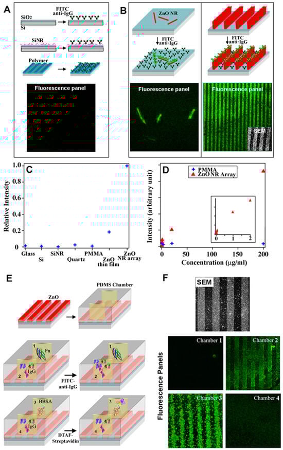 The fluorescence signal-enhancing phenomenon of ZnO NRs was first realized in a study comparing the fluorescence intensities of model bioanalytes assayed on different platforms, although the exact mechanism of signal enhancement was unclear at that time [21]. An array of ZnO NRs was fabricated directly upon the NR synthesis via chemical vapor deposition (CVD). A model bioanalyte of fluorescein isothiocyanate-conjugated anti-immunoglobulin G antibodies (FITC–anti-IgG) was deposited on the ZnO NR array, as well as on other control platforms of glass, quartz, Si, polymethylmethacrylate (PMMA), Si NRs, and ZnO thin film. Significantly enhanced fluorescence was monitored from FITC–anti-IgG on the ZnO NR array relative to the control platforms. The enhancement observed on the 1D ZnO NRs was also found to be greater than that on silicon nanorods (Si NRs) of similar dimensions, as well as that on a 2D ZnO thin film. The enhanced detection on ZnO NRs relative to Si NRs indicated that the enhancement was due to the inherent optical properties of ZnO rather than the inherently larger surface area of nanomaterials relative to the conventional substrates. ZnO NRs exhibited ~4-fold higher fluorescence signals than the ZnO thin film, which suggested that the reduced dimensionality of ZnO should be further considered for signal enhancement. These results are evidenced by the fluorescence data shown in Figure 3A–D. Overall, the study demonstrated for the first time that ZnO nanomaterials, particularly 1D ZnO NRs, are ideal platforms for enhancing the fluorescence signals of the bioanalytes placed in the vicinity of the ZnO NRs.