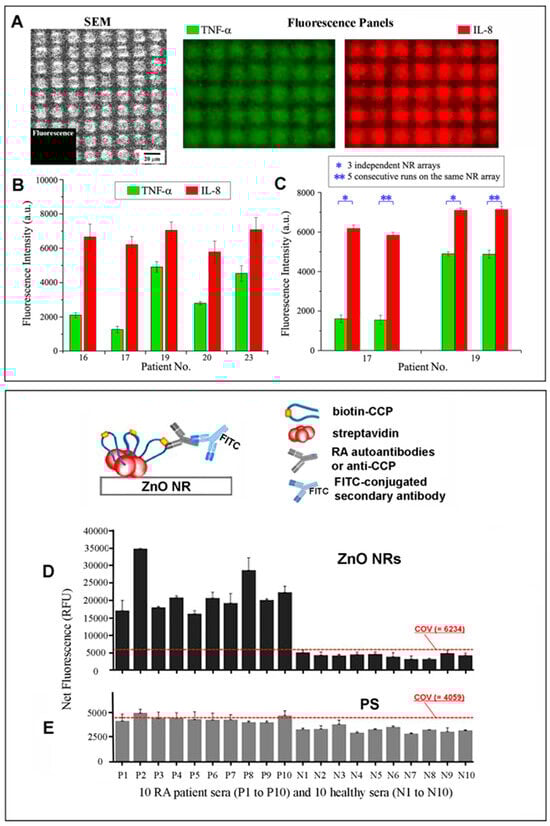 One-dimensional ZnO nanomaterials have been used to detect a wide variety of protein analytes, which have included IgG, glucose, anthrax protective antigen 83 kDa (PA83), carcinoembryonic antigen (CEA), alpha-fetoprotein (AFP), prostate-specific antigen (PSA), interleukin-8 (IL-8), tumor necrosis factor-α (TNF-α), anti-cyclic citrullinated peptide (anti-CCP), rheumatoid arthritis (RA) autoantibodies, adenosine triphosphate (ATP), fatty acid-binding protein (FABP), cardiac troponin I (cTnI), myoglobin (Mb), and ketoprofen (KP) [11,29,31,32,33,35,36,86,87,88,97,98,99,100,101,102,103,104,105,106,107]. Two examples of such applications of ZnO NRs as signal-enhancing platforms are shown for the detection of acute kidney injury (AKI) biomarkers and RA autoantibodies in Figure 4. A square array of ZnO NRs was used for the detection of IL-8 and TNF-α, which are cytokine biomarkers implicated in AKI [29]. The typical level of IL-8 in human samples is high enough for detection with a commercially available detection kit. TNF-α, however, is a low-level AKI biomarker whose concentration cannot be readily determined by existing means. ZnO NRs were successfully used in the study to simultaneously detect the concentrations of IL-8 and TNF-α in urine samples obtained from healthy subjects, as well as intensive care unit (ICU) patients. A sandwich-type immunoassay performed on the ZnO NR array involved a series of reaction steps, starting with a mixture of unlabeled, primary anti-IL-8 and anti-TNF-α antibodies, followed by BSA passivation. Then, their reactions with a mixture of the two cytokines and, lastly, with a mixture of fluorophore-conjugated secondary antibodies took place. For multiplexed detection, the secondary antibodies were labeled with Alexa488 for TNF-α and Alexa546 for IL-8. Samples from well over 50 patients were analyzed accordingly on a square array platform of vertically oriented ZnO NRs. Figure 4A displays representative fluorescence images from the multiplexed detection of TNF-α and IL-8 carried out on the ZnO NRs. The bar graphs in Figure 4B,C show fluorescence intensities measured for the two cytokines from different patients as well as the intra- and inter-assay variability results of the ZnO NR-based detection. The LODs of the cytokine immunoassays carried out on the ZnO NR platform were determined to be 5.5 fg/mL for IL-8 and 4.2 fg/mL for TNF-α. The detection sensitivity was much better when compared with the LODs of 7.5 pg/mL for IL-8 and 5.5 pg/mL for TNF-α obtained by a conventional ELISA-based kit. The possibility of the ZnO NR array for use in clinical diagnosis was further assessed by first quantifying the TNF-α concentrations in samples from patients at varying AKI stages. The results were then used to predict TNF-α levels expected from those individuals belonging to the groups of no AKI (healthy subjects), AKI developed within 24 h of ICU admission, and AKI developed after the first 24 h of ICU admission. ZnO NR-based diagnostic assays were also carried out in another investigation involving RA patient sera [31]. The levels of anti-CCP RA autoantibodies in patients, as well as healthy subjects, were determined by fluorescence measurements. The assay results obtained on ZnO NRs were then compared to those from a polystyrene (PS) platform. The bar graphs in Figure 4D,E summarize the results obtained from the same set of RA patients, as well as healthy subject samples. The study concluded that the ZnO NR platforms, even in assays involving human sera, could resolve very low fluorescence signals from bioanalytes that could not be determined on a conventional PS platform. In addition, ZnO NRs promoted enhanced detection by aiding the control of the CCP orientation. By introducing a biotinylated CCP to a streptavidin-functionalized ZnO surface, the RA autoantibody-specific motif around the citrulline of CCP could be better exposed for tight binding with anti-CCP.