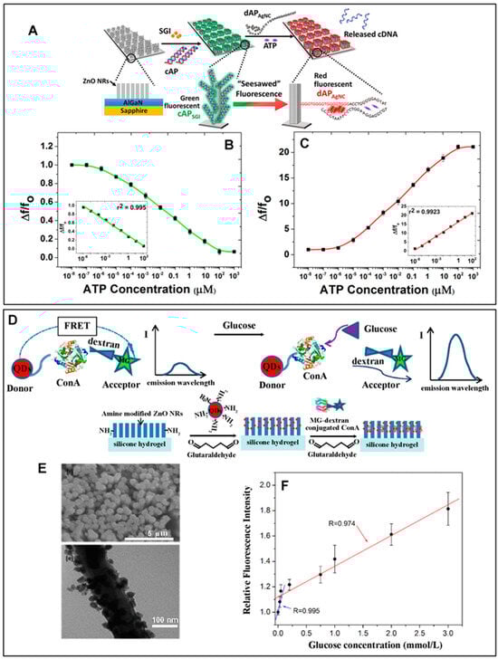 More examples of ZnO NRs used in fluorescence-based biodetection are presented. (A) The schematic illustration outlines the ATP detection scheme based on the green and red fluorescence signals associated with two split aptamers—a capture aptamer intercalated with green-fluorescent SGI (cAPSGI) and a detection aptamer with an extended DNA sequence required for the formation of red fluorescent AgNCs (dAPAgNC)—while employing vertical ZnO NRs as a signal-enhancing platform. The addition of ATP resulted in a decrease in green fluorescence from cAPSGI and a multi-fold increase in red fluorescence from dAPAgNC. (B,C) The ATP concentration-dependent fluorescence intensity changes, Δf/fo, are plotted for (B) SGI and (C) AgNCs. The insets display the magnified views of the linear regimes. (A–C) Adapted with permission from Ref. [32], copyright (2016) Elsevier B.V. (D) The schematic illustration depicts the glucose detection scheme of a FRET transducer made of Con A-conjugating CdSe/ZnS QDs as a donor and MG as an acceptor while employing a platform of ZnO NRs for signal enhancement. (E) The SEM micrographs in the top and bottom panels show a top-down view of the ZnO NRs deposited on a silicone hydrogel and a magnified view of a ZnO NR coated with CdSe/ZnS QDs. (F) The plot displays the linear relationship between the measured fluorescence intensity and the concentration of glucose. (D–F) Adapted with permission from Ref. [11], copyright (2016) Elsevier B.V.