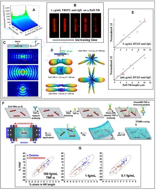 Exemplary properties of individual ZnO NRs and their utilities in biodetection are shown. (A) The contour map displays the fluorescence intensity of 200 μg/mL DTAF-anti-IgG deposited on a 25 μm long ZnO NR. The DTAF-anti-IgG fluorescence signals were intense on the NR end relative to the NR side facets. The fluorescence signals on the single ZnO NR also persisted under constant irradiation, reaching a half-life (t1/2, the time point at which there is a 50% reduction of the intensity measured at t = 0) of ~1 min. They were extended much beyond those measured on the conventional substrates of PMMA and PS, whose t1/2 were ~15 and 30 s, respectively. Reprinted with permission from Ref. [22], copyright (2014) Royal Society of Chemistry. (B) The time-lapse fluorescence panels display the spatial and temporal emission behaviors of 1 μg/mL TRITC-anti-IgG deposited on a ZnO NR. (C) The FDTD simulation results in the top, middle, and bottom panels correspond to the radiation patterns from a single 576 nm emitter whose polarization is along the X, Y, and Z directions, respectively. (D) The nanomaterial size effect of a ZnO NR on FINE was evaluated by FDTD simulations. Far-field radiation patterns were obtained from a 517 nm electric dipole and shown for each ZnO NR of the specified length (L) and width (d). The spatial radiation patterns observed from the Z and X directions are displayed in the top and bottom simulation panels, respectively, for the ZnO NRs with the specified dimensions. (E) The plots show the effect of the NR length on FINE and DoF. Different concentrations of DTAF-anti-IgG were coupled to ZnO NRs of various lengths, and the DTAF-anti-IgG fluorescence signals on the ZnO NRs were measured. In all cases, the normalized fluorescence intensity value of ΔI (Iavg,NRef − Iavg,NRsf) indicated that the DoF increased as the NR length became longer. The subscripts of avg, NRef, and NRsf stand for average, NR end facets, and NR side facets, respectively. (B–E) Reprinted with permission from Ref. [23], copyright (2015) Royal Society of Chemistry. (F) The scheme illustrates the overall fabrication process of the TNF-α sandwich immunoassay based on individual ZnO NRs. The NR immunoassay platform was integrated into a PDMS elastomer for the application of uniaxial tensile (blue) and compressive (red) strain with a microvice during fluorescence measurements. (G) The plots display % FINE versus % strain in NR length for TNF-α concentrations of 100, 1, and 0.1 fg/mL. Squared data points in blue correspond to the NRs undergoing tension, while circled data points in red refer to the NRs undergoing compression. The solid black lines represent the linear fits for the data points, while the black dashes show the 95% confidence ellipses. Positive values on the x-axis of % strain in NR length denote tension, while negative values indicate compression. (F,G) Reprinted with permission from Ref. [30], copyright (2024) MDPI.