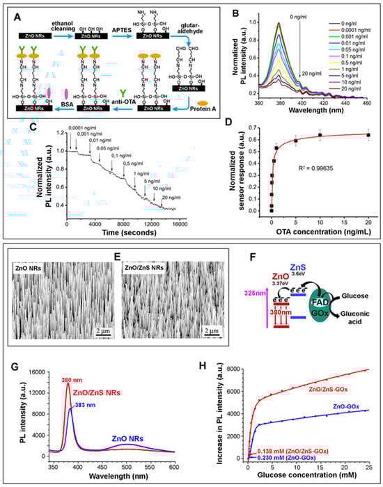 1D ZnO nanomaterials have also been applied for both the solution- and solid-state PL detection of glucose, lactate, cholesterol, ochratoxin A (OTA), grapevine virus A-type (GVA) proteins, and EC DNA [12,13,42,43,44,132,133,134]. For instance, ZnO NRs with NBE emission at 387 nm and DLE at 575 nm were used for EC DNA detection [42]. Successive addition of EC DNA led to a decrease in the DLE and, at the same time, the formation of a new peak at ~426 nm, potentially due to hydrogen bonding between the ZnO NRs and the DNA. The DLE quenching and the formation of the 426 nm peak took place under equilibrium, which was indicated by a near isosbestic point observed at ~517 nm. This process generated white light from the ZnO NRs, whose signals were selective to EC dsDNA over the control samples of CT, ML, and EC ssDNA. Using this scheme, the EC DNA detection by ZnO NRs resulted in an operational range of 0.102–0.894 µM and a LOD of 28.4 nM. Another effort involved the development of an immunosensor for ochratoxin A (OTA) based on Protein A-modified ZnO NRs on a glass substrate [43]. The ZnO NR-based sensor fabrication and detection results are displayed in Figure 7A–D. The synthesized ZnO NRs with NR dimensions of ~90 nm in diameter and ~470 nm in length exhibited the characteristic NBE at ~379 nm and a relatively weak, broad DLE at ~540 nm. Protein A was covalently attached to pre-silanized ZnO NRs for the oriented binding of the anti-OTA antibodies (anti-OTA) and to enhance the NBE intensity via dipole–dipole and electrostatic interactions. The binding of OTA to anti-OTA altered the electrostatic interactions between Protein A/anti-OTA and ZnO NRs, potentially inducing partial dissociation and degradation of the Protein A/anti-OTA immunocomplexes. The NBE intensity decreased with increasing OTA. The OTA detection rendered an operational concentration range of 0.1–1 ng/mL with a LOD of 0.01 ng/mL.
