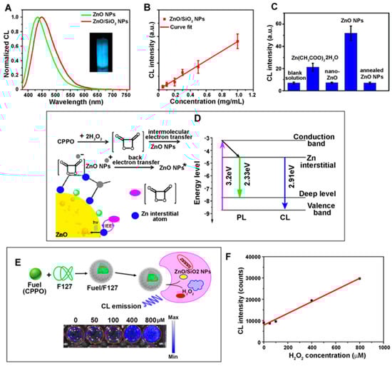 ZnO NPs coated with SiO2 were used as a CL probe in HeLa cell imaging. (A) The graph shows the CL spectra of the ZnO NPs and ZnO/SiO2 NPs in CPPO/H2O2 solution. The photograph of the CPPO/H2O2 solution taken in the dark after adding the ZnO/SiO2 NPs is shown in the inset. (B) The plot displays the CL intensity versus the concentration of the ZnO/SiO2 NPs. (C) The PL spectrum of the blank, Zn(Ac)2·2H2O, nano-ZnO NPs, ZnO NPs, and annealed ZnO NPs in the CL analysis system. The CL intensity induced in the CPPO/H2O2 solution is displayed in the bar graphs for the ZnO NPs as well as other controls such as the blank solution, Zn(CH3COO)2·2H2O, nano-ZnO, and annealed ZnO NPs. The ZnO NPs and Zn(CH3COO)2·2H2O exhibit CL enhancement, whereas no impact on CL is observed from the nano-ZnO and annealed ZnO NPs. From this, the interstitial Zn atoms were deduced to be engaged in the CL process. (D) The schematics illustrate the CL process of the ZnO NPs. CPPO reacts with H2O2, producing 1, 2-dioxetanedione. With the injection of the ZnO NPs, a chemically initiated electron exchange luminescence (CIEEL) occurs between the intermediate and surface interstitial Zn atoms of the NPs. The interstitial Zn defects are then excited and transited to the VB, emitting blue light. The ZnO NPs exhibit yellow PL emission due to DLE associated with the electron transition from the energy level of the interstitial Zn atom to that of Zn vacancy. The CL process affects the ZnO PL, causing a red-shift in PL. (E) The schematic illustration represents the use of the biocompatible ZnO/SiO2 NPs in CL-based cell imaging. The CL images were taken from HeLa cells cultured with the ZnO/SiO2 NPs for 6 h and then added to the CPPO mixture of different H2O2 concentrations, as specified in the bottom panel. (F) The CL intensities measured from the CL images in (E) are displayed. The CL intensity was directly proportional to the H2O2 concentration. Adapted with permission from Ref. [143], copyright (2020) Elsevier B.V.