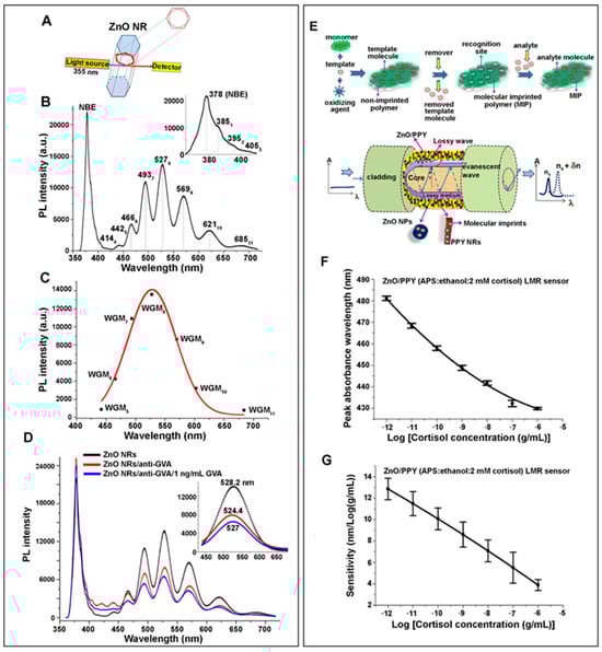 Examples of WGM and LMR biosensors fabricated from ZnO nanomaterials are shown. (A) The schematic illustrates a ZnO NR-based WGM biosensor and the WGM optical paths generated inside the NRs. (B) The plot corresponds to the PL spectrum of the Mn-doped ZnO NRs vertically oriented on a Si substrate. The PL spectrum shows the NBE emission at 378 nm, as well as multiple broad DLE peaks between 450–650 nm. WGMs of the DLEs were formed inside the optical resonators of the ZnO NRs, as annotated for each WGM peak. (C) The Gaussian fitting result of the WGM data in (B) is displayed in the plot. The WGM emission maximum occurred at 528.2 nm for the ZnO NRs, whose peak was blue-shifted to 524.4 nm upon anti-GVA immobilization to the NRs and subsequently red-shifted to 527 nm after further incubation with GVA. (D) The PL spectra of the ZnO NRs, as well as those treated with anti-GVA and subsequently with 1 ng/mL GVA, are presented. The inset belongs to the Gaussian-fitted WGM peaks. (A–D) Adapted with permission from Ref. [44], copyright (2020) Elsevier B.V. (E) The pictorial representation shows a lossy-mode resonance (LMR) biosensor fabricated from a ZnO thin film with polypyrrole (PPY) prepared with a molecular imprinting polymer technique. The LMR sensor was subsequently used in cortisol detection. (F) The plot displays the absorbance wavelength of the LMR peak as a function of cortisol concentration. A blue shift of 51.23 nm in the LMR absorbance wavelength was observed for the cortisol concentration range of 10−12–10−6 g/mL. (G) The sensitivity for the different cortisol concentrations is shown for the LMR sensor prepared with 20% ZnO/PPY. The sensitivity was evaluated from the sensor calibration curve by taking the derivative of the curve fit equation with respect to cortisol concentration. A maximum sensitivity of 12.86 nm/Log (g/mL) was yielded for 10−12 g/mL of cortisol. This rate of change in the absorbance wavelength decreased with increasing cortisol concentration. (E–G) Adapted with permission from Ref. [48], copyright (2016) Elsevier B.V.
