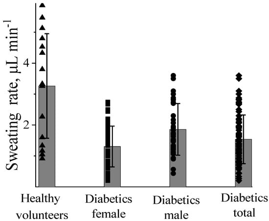 The sweating rate has been determined by dividing the collected sweat volume by the sweating time. Figure 1 displays the sweating rates measured several times for 22 diabetics, among them 10 men and 12 women, as well as for healthy subjects. As can be seen, the sweating rate of the diabetics is generally lower as compared to the healthy subjects. Similarly to the healthy subjects, the male diabetics are sweating more intensively than the female diabetics. However, even the lowest rate detected for a female diabetic subject (0.2 µL min−1) is, for example, at the upper range of the insulin pump [34]. Moreover, the range of diabetics’ sweating rates overlaps that of healthy subjects (Figure 1). We are, thus, able to conclude that the sweating rates of diabetics are sufficient to ensure the operation of wearable devices.