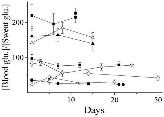 The frequency of the recalibration for a certain diabetic subject depends on how stable the ratio of blood-to-sweat glucose is. As can be seen in Figure 3, this ratio can be varied within an order of magnitude from 20 to 220. However, for a particular diabetic subject, the ratio of blood-to-sweat glucose has been found to be stable with the precision of measurements (Figure 3), despite the time frame of the investigations lasting up to 30 days in some cases. It is thus possible to conclude that the blood-to-sweat glucose ratio is stable up to a period of weeks, and it is not necessary to recalibrate the blood glucose content against the sweat levels upon operation of a single wearable device.