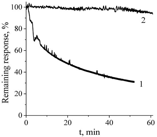 Remaining response of the Pt-based (1) and Prussian Blue-based (2) glucose biosensors toward 250 µM glucose upon monitoring of undiluted human sweat.