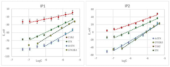 Responses of the sensors IP1 and IP2 to four PSTs, dcSTX, STX, C1&2, and GTX2&3 in the solutions prepared in Tris HCl buffer (0.25 mmol L−1, pH7). Standard deviation of three measurements with the same sensor and regression lines are shown.