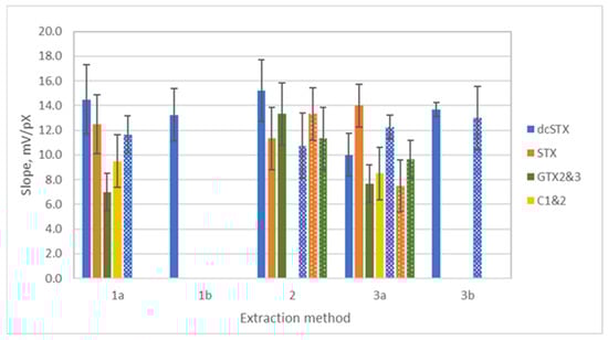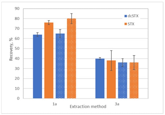 After having selected methods 2 and 3a for potentiometric toxin detection, the efficiency of the sample preparation procedures in quantitatively extracting toxins from the bivalve tissues was evaluated. Recovery tests were conducted in uncontaminated mussel and oyster matrices spiked with dcSTX and STX standards, and toxin extracts were prepared using methods 1a and 3b and then analyzed by LC-FLD. It is important to note that method 2 is a simplified version of reference procedure 1a, which does not involve the extract clean-up using a C18 cartridge. As clean-up is required for PSTs’ quantification in bivalve extracts using LC-FLD, the extracts prepared using methods 2 and 3a needed to be submitted to clean-up using a C18 cartridge. Thus, the resulting extracts corresponded to the reference AOAC method 1a and method 3b, respectively. The recoveries using reference method were ca. 65% for dcSTX and 80% for STX, while recoveries using extraction with water were lower, varying between 36 and 40% for both toxins (Figure 3).