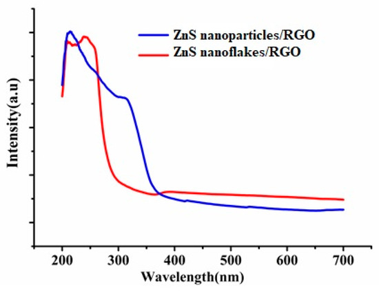 Figure 2 displays that both ZnS/RGO nanocomposites had strong absorption behavior at the region of the UV light. More importantly, at the wavelength of 280 nm, the absorption intensity of the ZnS nanoflake/RGO nanocomposite is larger than that of the ZnS nanoparticle/RGO one. This means that the ZnS nanoflake/RGO nanocomposite is more suitable for UV light at a wavelength of 280 nm.