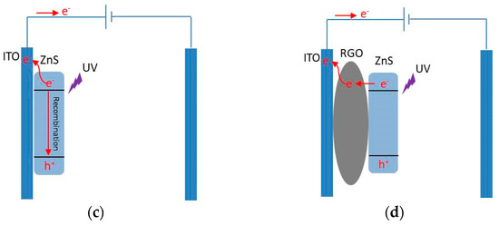 Figure 3b exhibits that with the RGO introduced, the ratios of I/light to I/dark increased remarkably and reached 18.4 and 10.5 for the ZnS nanoflake/RGO and ZnS nanoparticle/RGO nanocomposites, respectively. This is because RGO, with an excellent conductivity, can trap photoelectrons and effectively inhibit the rapid recombination of generated electron–hole pairs [42]; refer to Figure 3c,d. Moreover, Figure 3b also exhibits that the I/light of the ZnS nanoflakes/RGO is remarkably stronger than that of the ZnS nanoparticles/RGO. This is because compared to the latter, the former had a larger contacting surface area between the ZnS and RGO due to the more adequate encapsulation of ZnS nanocrystals with RGO nanoflakes; refer to Figure 1c,d. This made the electrons generated in the ZnS nanoflakes more easily trapped in the RGO, which further led to a better photoelectric response of the ZnS nanoflake/RGO nanocomposites.