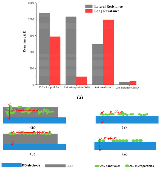 (a) Resistance of ZnS nanocrystals and ZnS/RGO nanocomposites along the lateral and longitudinal directions. Schematic diagrams of lateral and longitudinal electron transfer ability of the (b,c) ZnS/RGO nanocomposites and (d,e) ZnS nanocrystals.