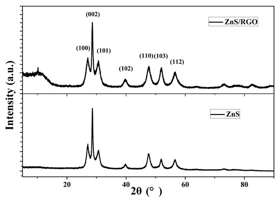 The XRD results for the ZnS nanoflakes and ZnS nanoflakes/RGO are shown in Figure 5. The peaks of 2θ at 27.083°, 28.617°, 30.600°, 39.802°, 47.674°, 52.050° and 56.693° of both indicate wurtzite ZnS (JCPDS File No. 75-1534). The weak peak of ZnS/RGO at 10.234° was caused by the RGO [17]. The peak of the ZnS/RGO nanocomposite is more even than that of the pure ZnS nanoflakes. This is because, differently from the pure ZnS nanoflakes, which mostly lie on the electrode, the ZnS nanoflakes are wrapped in the RGO layers (see Figure 1c), which leads to more positions and directions of the nanoflakes facing the X-ray irradiation. This suggests once more that the ZnS nanoflakes were completely encapsulated by the RGO.