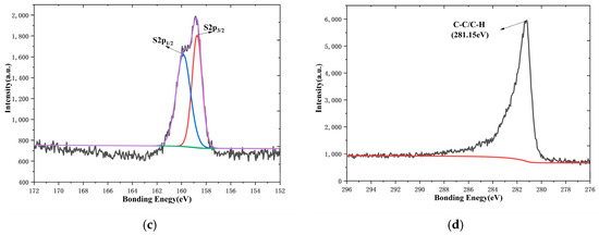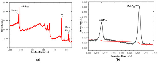 Figure 6a shows the full spectrum of the ZnS nanoflakes/RGO, in which the C1s peak; Zn2p1/2 and Zn2p3/2 peaks; and S2p1/2 and S2p3/2 peaks can be found. This indicates the existence of a RGO and zinc sulfide compound. The XPS spectrum of Zn2p in Figure 6b has two main peaks, at 1018.97 eV and 1041.09 eV, corresponding to 2p1/2 and 2p3/2, respectively, indicating Zn2+ in a normal oxidation state [42]. Figure 6c shows the S2p3/2 and S2p1/2 peaks for S2− at 158.75 eV and 160.05 eV [42]. The peak at 281.15 eV of the spectrum of C1 in Figure 6d can be attributed to the presence of the C-C bond of the RGO [42].