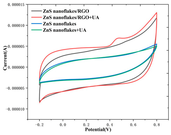 Cyclic voltammetry (CV) can reflect the redox reaction on the surface of a working electrode well. Figure 7 shows that compared to pure ZnS nanoflakes, the ZnS nanoflakes/RGO show a larger current at voltage from −0.2 to 0.8 V. This is due to the better conductivity of the ZnS nanoflakes/RGO than that of the pure ZnS nanoflakes, which is in agreement with the results of Figure 4. More importantly, with and without uric acid added, only the CV curve of the ZnS nanoflakes /RGO shows a clear peak at 0.4 V. This indicates that, attributable to the better conductivity and photocurrent behavior of the ZnS nanoflakes/RGO, the ZnS nanoflake/RGO nanocomposite had better electrocatalytic activity than the pure ZnS nanoflakes; refer to Figure 3 and Figure 4.