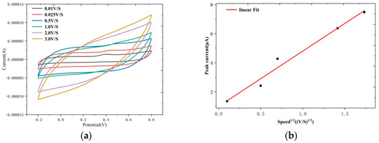 (a) Cyclic voltammetry curves of ZnS nanoflakes/RGO with UA at different voltage scanning speeds and (b) the linear fit curve of the current peak versus the square root of the scanning rate.
