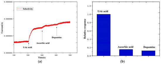 Figure 10a shows that compared to the increased current caused by uric acid, the current responses of dopamine and ascorbic acid were significantly small. The relative responses of the ascorbic acid and dopamine compared with the uric acid are 0.1543 and 0.1234, respectively; refer to Figure 10b.
