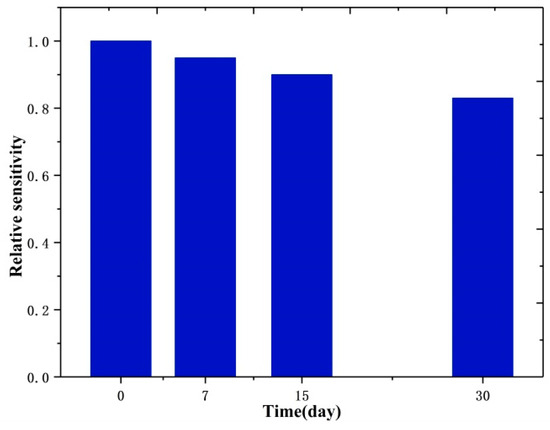 The signal change during long-term usage for the UA biosensor has been determined and is shown in Figure 11. It was observed that the original response of the ZnS nanoflake/RGO electrode with UA remained at about 90% until 15 days later and 83% after a month, which is larger than those of the non-enzymatic and enzymatic electrochemical sensors (80% and 67.4% after 30 days) in previous works [53,54]. This is ascribed to the RGO, which efficiently protects the active sites on ZnS nanoflakes/RGO and provides the friendly microenvironment with an inertia property. This suggests that the PEC electrode has great long-term stability. In addition, the reduction (around 17% after 30 days) in sensitivity was mainly caused by the active site consumption of the electrode in the air.