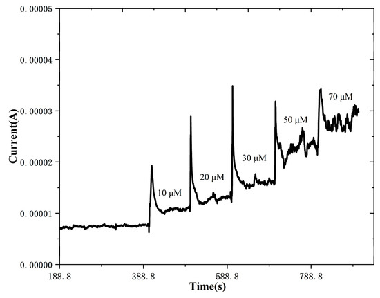 Current response of the ZnS/RGO working electrode with continuous addition of uric acid at an applied potential of 0.4 V in artificial sweat.