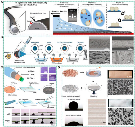 Preparation of the surface-printed liquid metal-based fibers. (A) Schematic illustration of BiLMP-coated fiber [84]. Copyright: (2023) Springer Nature. (B) Schematic illustration and SEM images of the fabrication of LM-pSBS fiber with one layer of LM coated on the surface of pSBS fiber [85]. Copyright: (2024) WILEY-VCH. (C) Schematic structure and the fabrication process of PU@PMA@EGaIn (PPE) fibers. Photos of the fibers and the supercapacitor [86]. Copyright: (2021) American Chemical Society. (D) Schematic illustration of the fabrication process and optical and SEM images for the liquid metal micromesh on the SEBS microfiber textile. Contact-angle images of liquid metal droplets on the SEBS microtextile and Cu-coated SEBS microtextile after treatment in NaOH aqueous solution [87]. Copyright: (2022) American Chemical Society.