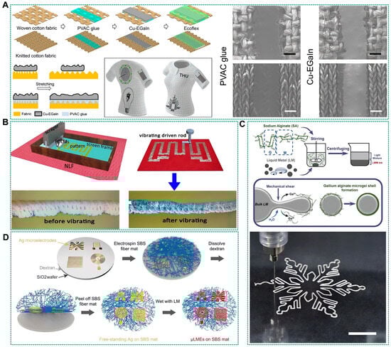 Currently, liquid metal-coated fibers are commonly manufactured by pre-woven fibers to form a fabric. Afterward, the fabric is used as a substrate, and a liquid metal conductive coating is adhered to its surface to create a flexible sensor on the fabric substrate. To achieve stable adhesion of the liquid metal coating on the fabric, materials with high adhesion to liquid metals are used, such as SBS [91] and Ecoflex [92]. Furthermore, to allow high mass loading of liquid metal and possesses a smart conductivity-strain-enhancing feature, the SBS mat was immersed in a precursor solution containing silver trifluoroacetate (Ag+[COOCF3−]), followed by a chemical reduction process with hydrazine to produce the Ag-coated SBS mat. The surface coverage of Ag on the SBS fibers increased proportionally with the concentration of hydrazine. The contact angle of liquid metals with an Ag-coated SBS mat can be reduced significantly, thus enabling the adhesion of more liquid metals [93]. However, fabrics used to manufacture garments are often woven from natural fibers and have a rough surface topography. Previous studies have found that this rough interface makes it difficult for liquid metals to adhere to its surface [94]. Therefore, Guo et al. used screen printing to cover the surface of cotton fabric with a polyvinyl acetate (PVAC) adhesive film. This adhesive film penetrated into the voids between the fabric fibers and formed a smooth and flat interface on the fabric surface. In addition, this adhesive film has excellent adhesion to liquid metals, firmly attaching them to the fabric’s surface, as shown in Figure 7A [95]. Furthermore, to enhance the electrical conductivity and stability of the fabric circuit structure, a semi-liquid metal slurry infused with copper metal microparticles (Cu-EGaIn) was utilized in place of the traditional liquid metal gallium-indium alloy. This Cu-EGaIn slurry, with its higher electrical conductivity and superior molding capabilities, could be rapidly adhered to the PVAC adhesive film using a roller coating technique. To further improve the stability and waterproofing of the liquid metal clothing circuit, an Ecoflex adhesive film was used to encapsulate the liquid metal circuit surface. In another approach, Ou et al. introduced a vibration-assisted printing method for partially oxidized liquid metals (POLMs) to ensure the formation of a stable liquid metal network within nylon lycra fabric (NLF), as shown in Figure 7B [96]. This method first reduces the surface tension of the liquid metals through partial oxidation. The POLMs, susceptible to external forces, are reinforced by vibrating them to fill the inner spaces of cloth fibers, forming a network that is protected by the NLF fiber network, thus maintaining robustness against external forces. As a result, POLMs within the garment exhibit high metallic conductivity and durability without adding extra thickness to the fabric.