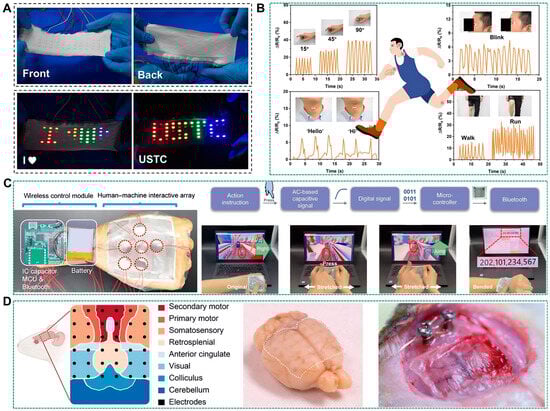 Furthermore, Zheng et al. created ultrahigh-density micro-liquid metal electrodes (μLME) arrays for capturing electrocorticography (ECoG) signals from soft, curved, and complex neural interfaces [98]. These μLME arrays were applied to cover major cortical subdomains in rats, including motor, somatosensory, visual, and retrosplenial cortices. The μLME arrays are characterized by small-diameter round electrode units (500 μm), fine interconnections (40 μm), and a high channel density of 100 electrodes per square centimeter. Their mechanical compliance, similar to that of brain tissue, allows for conformal attachment to the cortical surface, as illustrated in Figure 8D. The μLMEs demonstrated long-term biocompatibility, with successful implantation for over 8 months.