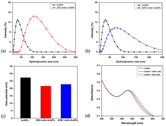 Gold nanoparticle-antibody conjugate characterization. (a) DLS size for bare AuNPs and anti-zearalenone attached antibody AuNPs; (b) DLS size for bare AuNPs and anti-aflatoxin B1 attached antibody AuNPs; (c) zeta potential analysis for bare AuNPs, ZEN mAb-AuNPs, and AFB1 mAb AuNPs; (d) change in UV-Vis spectroscopy after antibody attachment.