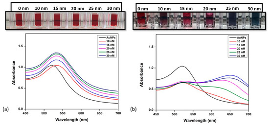 Detection of aflatoxin B1. (a) UV/Vis/NIR spectroscopy of AuNP-mAb after addition of different concentrations of aflatoxin; (b) change in UV/Vis/NIR spectra and color after inducing high salt concentration of 200 mM. Inset: visual color changes in corresponding solutions with added toxin concentrations.