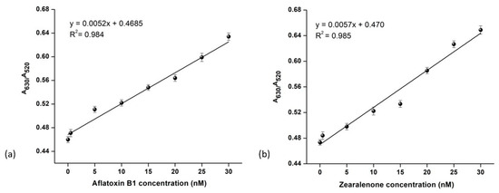 In Figure 5b, the absorbance values show a good linear correlation with the concentration of AFB1 from 10 to 30 nM, with the regression equation y = 0.0052x + 0.4685 and a correlation coefficient R2 = 0.984. The limit of detection was calculated to be 0.156 ng/mL, which is 0.5 nM (m.w. of AFB1—312.27 g/mol), lower than the maximum residue limit (5.0 µg/kg) as defined by the European Commission [5]. For ZEN, the sensitivity of the assay was assessed in the same range as AFB1. The absorbance ratio was seen to be linearly proportional to the concentration of ZEN in the range 10–30 nM (Figure 5a) and is fitted by the equation y = 0.0057x + 0.470, R2 = 0.985. The LOD of the assay was estimated to be 0.159 ng/mL, which is 0.5 nM (m.w. of ZEN—318.36 g/mol), lower than the maximum residue limit, which is 10.0 µg/kg [4].