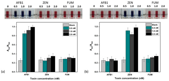 Selectivity of the colorimetric sensor for AFB1. (a,b) ZEN detection containing AuNP-mAb solution with different concentrations of toxins along with a blank (no mycotoxin). Inset: visual color changes in the corresponding solutions with added toxin concentrations. All the readings were performed in triplicate (n = 3).