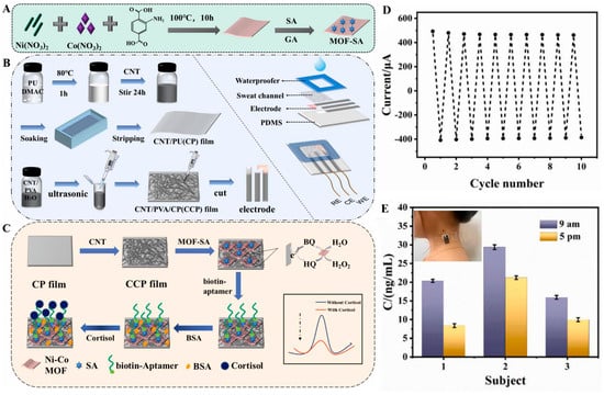 (A) Scheme for the synthesis of bimetallic MOF and streptavidin-conjugated MOF. (B) Fabrication of flexible and wearable patch sensors. (C) Scheme for the fabrication of a cortisol sensor. (D) Redox peak current changes in the sensor in the presence of hydroquinone and hydrogen peroxide for 10 cycles. (E) Cortisol detection in sweat samples (inset: photograph of a volunteer wearing the patch sensor). Reproduced with permission from [55].