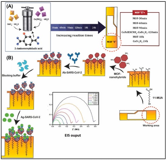 (A) Graphical representation for the hydrothermal synthesis of CoFe-MOF-CoFe2O4 nanohybrids. (B) Stepwise fabrication of the SARS-CoV-2 sensor and its electrochemical response. Reproduced with permission from [56].