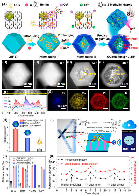 (A) Graphical representation for the stepwise synthesis of GOx/Hemin@NC-ZIF. (B–E) TEM images at different etching times. (F) HAADF and its EDS line scan. (G) EDS mappings for various elements. (H) Relative activities of different electrocatalysts. (I) Photograph of wearable sweatband and its catalytic mechanism toward glucose oxidation along with perspiration analysis on a smartphone display. (J) Relative activities of different electrocatalysts in various reaction conditions. (K) Glucose concentration obtained through perspiration and blood of a human within 14 days. Reproduced with permission from [70].