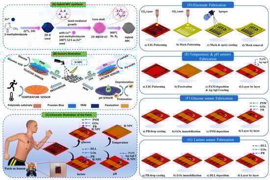 Graphical representation of (A) stepwise synthesis of hybridized nanoporous carbon, (B) construction of glucose, lactate, temperature, and pH sensors, and (C–G) stepwise fabrication of the wearable patch sensor and photograph of a volunteer wearing the patch sensor during exercise. Reproduced with permission from [71].